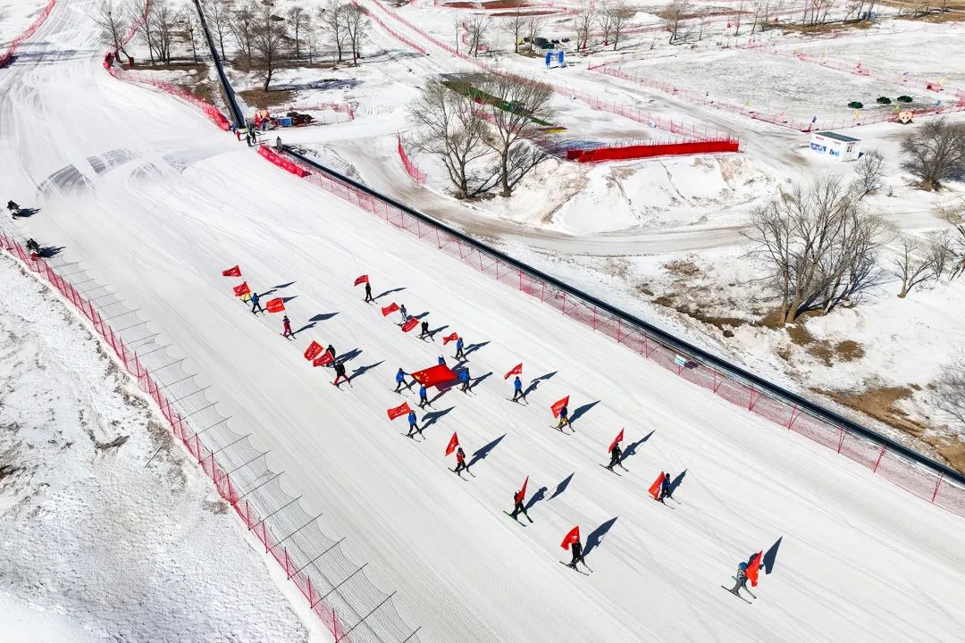 由库伦淖尔滑雪场裁判员组成的护旗队飞驰而来