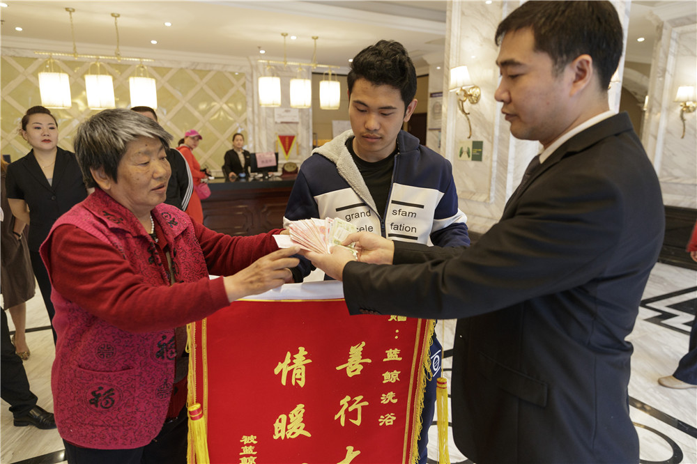 4月28日下午4点多钟,张家口蓝鲸大厦洗浴部收到了一面锦旗,上写“善行大义、情暖心田”八个大字。这是怎么回事呢?